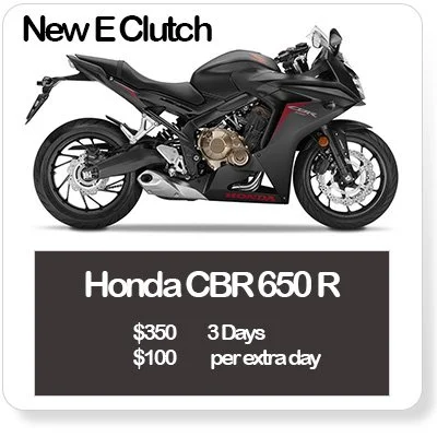 this rental is provided directly through Ride rive Fly Call 0415 363 877 honda cbr 650r$350 3 days minimum$100 per extra dayminimum age 25fully comprehensive insuranceunlimited kms$1,000 bond$1,000 excess limited to 1 riderPick up and Drop Off from Springwood, QLD Vehicle Hire Agreement